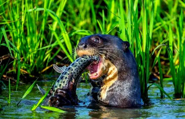 然而,有一种动物能与它们相提并论,那便是南美巨獭。它在当地拥有“水中美洲豹”和“河狼”的外号,足见其凶猛程度。作为鼬科动物,南美巨獭和非洲平头哥蜜獾一样,天不怕地不怕,谁都敢惹。